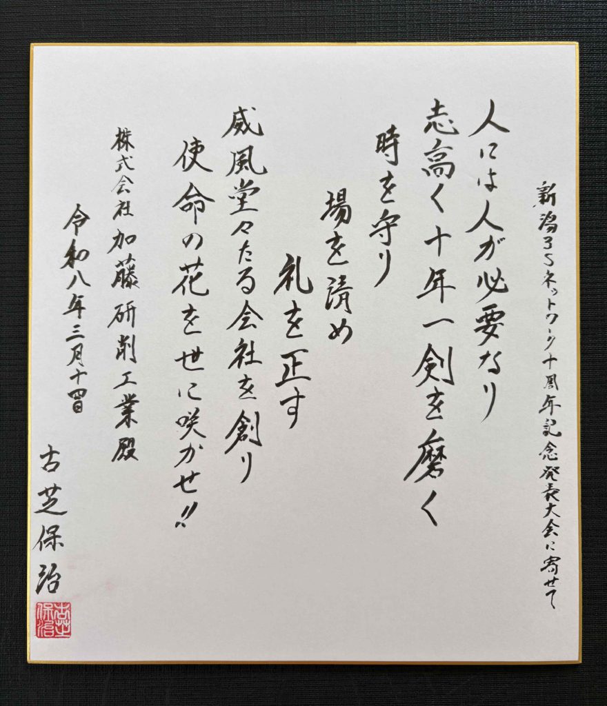 当日、古芝先生より頂いた色紙です。「使命の花を咲かせられる会社」へ成長したいと思います!